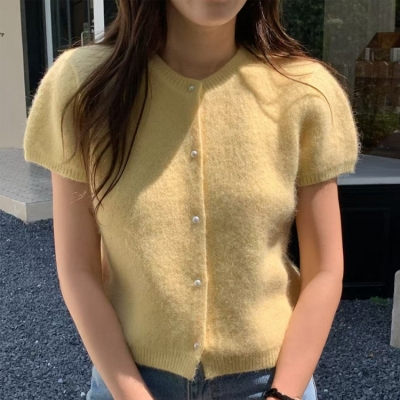 on.[CD584]앙고라퍼프반팔진주가디건